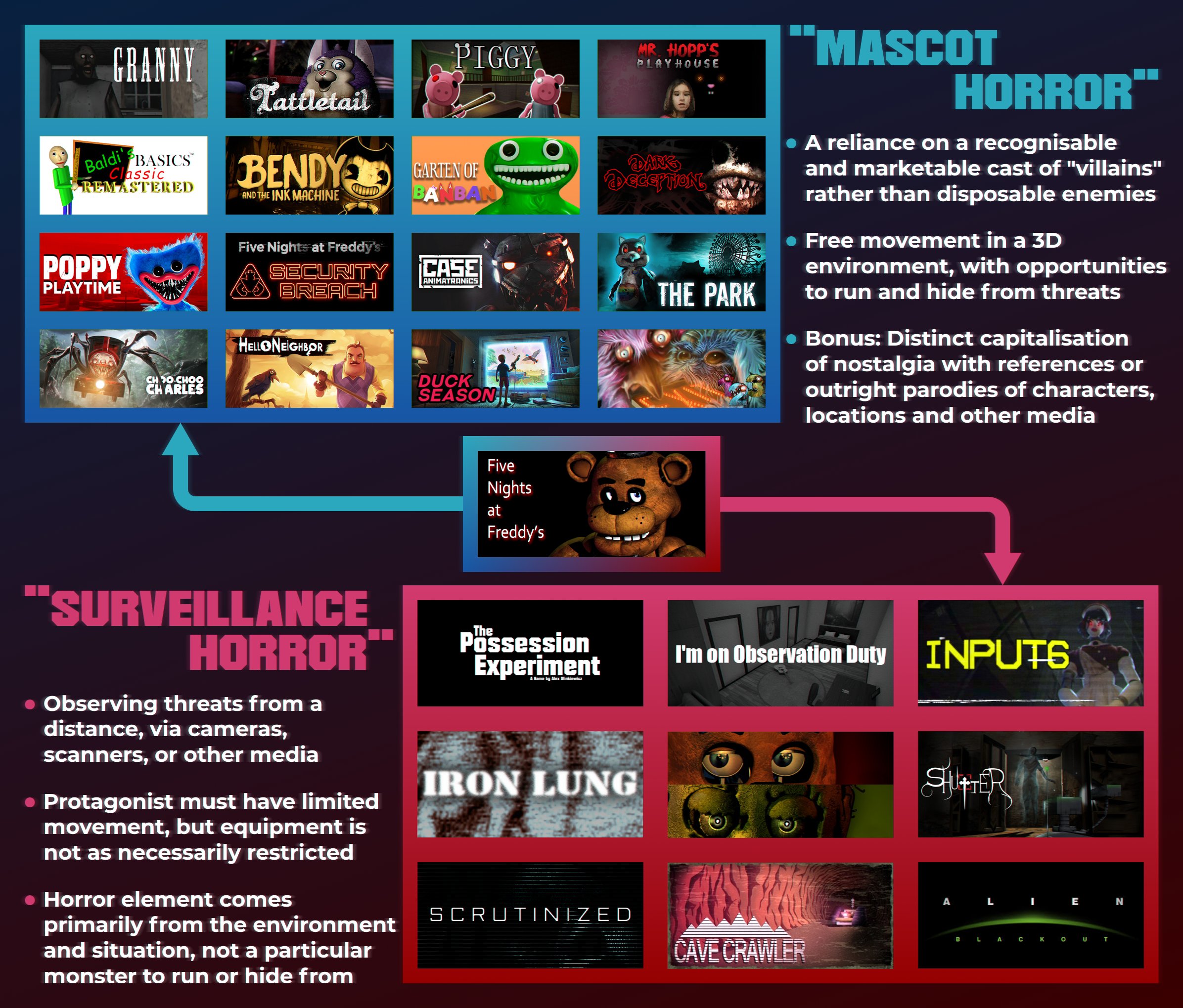 아이들이 좋아할 것 같은 귀여운 동물 로봇이 주인공의 목숨을 위협한다는 내용. 로봇이 자유롭게 움직이는건 귀신이 들렸다는 설정으로 무마하여 핍진성을 부여했다. 1편에 나오는 애니매트로닉스들은 생긴 것 자체는 무섭게 생기지 않았으나 로봇이 주는 차갑고 무감정한 인상, 저벅저벅 걸어오는 사운드와 웃음 소리, 그리고 강렬한 점프스케어를 통해 공포게임으로 흥행했고 이후 2편부터는 낡고 허름해진 로봇들이 나오면서 시각적으로도 두려움을 준다.[9] 4편부터는 아예 기괴하게 제작하였으며 SL은 어딘가 불편한 느낌의 기괴한 모습으로 모델링을 만들고 내골격을 보여주는 연출을 통해서 공포심을 가중시켰다.
